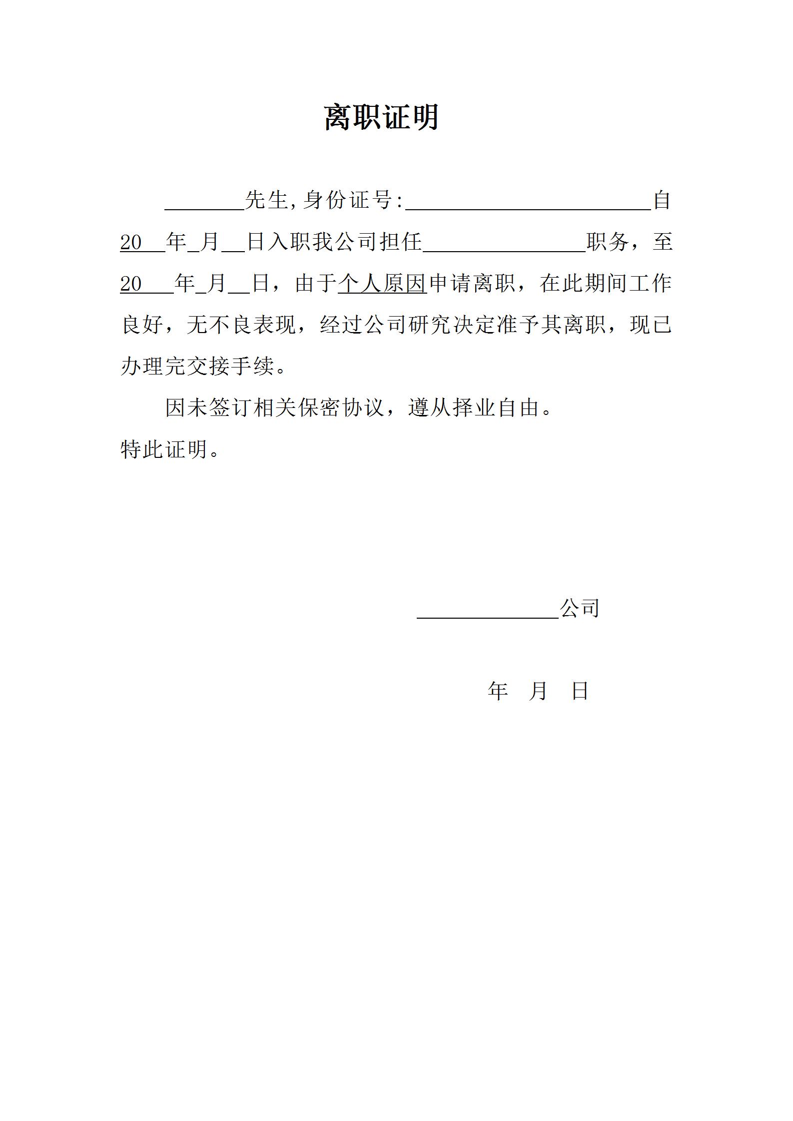 先生,身份证号: 自20 年 月 日入职我公司担任 职务,至 20 年 月 日,由于个人原因申请离职,在此期间工作良好,无不良表现,经过公司研究决定准予其离职,现已办理完交接手续。